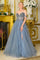 Romantic and ethereal, this A-line floor-length evening dress features sheer off-the-shoulder straps and a matching sheer, deep V-neckline corset bodice. The bodice is richly embellished with intricate embroidery, sparkling beads, sequins, and dimensional 3D floral appliqués for a textured look. Crafted from a layer of soft tulle over a glitter mesh underlay, the gown shimmers with every step. A subtle slit adds to this dreamy design, perfect for making a graceful statement.
