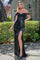 Elegantly embellished with intricate embroidery and sparkling jewels, this fitted floor-length gown is crafted from a combination of stretch satin and sheer mesh. Off-the-shoulder straps frame the sheer V-neckline, leading into a beautifully adorned corset bodice. The stretch satin skirt features soft pleating on one side and a chic thigh-high slit, as well as gathering at the back.