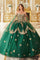 Step into the spotlight with our enchanting off-the-shoulder emerald ball gown, perfect for your Quinceanera celebration. The layered glitter tulle full skirt, adorned with a scalloped gold lace overlay, creates a dreamy, fairytale-like silhouette that will captivate all who lay eyes on you. The bodice, featuring intricate gold floral lace appliques, adds a touch of elegance and sophistication, while the long, removable matching glitter tulle cape sleeves offer versatility and grace. Delicate gold butterfly appliques adorn the skirt and off-the-shoulder sleeves, adding a whimsical and enchanting touch to the ensemble. With a lace-up corset back closure, this gown ensures a perfect fit that will make you feel like royalty as you dance the night away. Make unforgettable memories in this magical dress that's as unique and special as you are.
