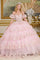The sheer V-neck corset bodice is richly adorned with bejeweled trim, intricate embroidery, sequins, glitter, and delicate beading. These embellishments continue throughout the layered skirt, which features scalloped embroidery along the hem. The skirt extends longer in the back, with the bottom layer flowing into a train. Complementing the gown are detached off-the-shoulder sleeves, designed with two ruffled layers — one finished with a scalloped edge and the other accented with matching embellishments — adding a cohesive touch to the overall look of the dress.